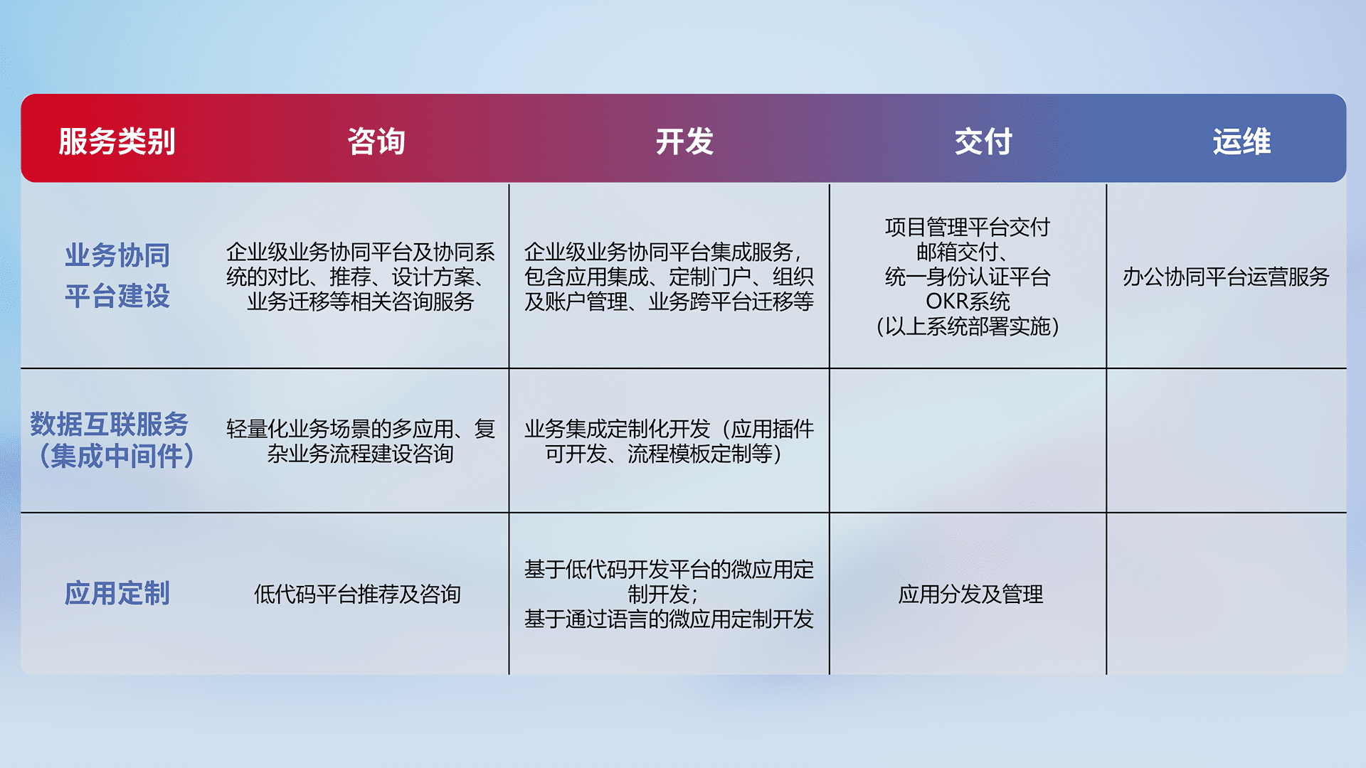 针对钉钉、、企微、、、IDaas等平台级产品提供产品的规划、、方案、、、交付、、定制化开发等服务,,,,实现如统一协同办公、、、智能客户服务、、混合会议管理、、智能数据查询、、、等业务场景,,,,实现数字化转型。。。