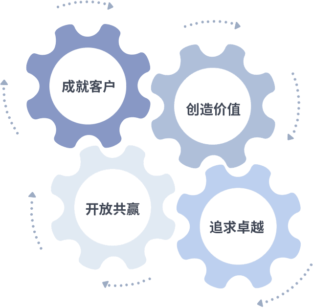 成就客户是一切决策的出发点,,,,创造价值是衡量所有工作的标准,,,追求卓越是我们做事做人的态度,,,开放共赢是我们的格局也是最终的结果。。。价值观的齿轮环环相扣,,,推动着组织里的每个人不断向前。。。